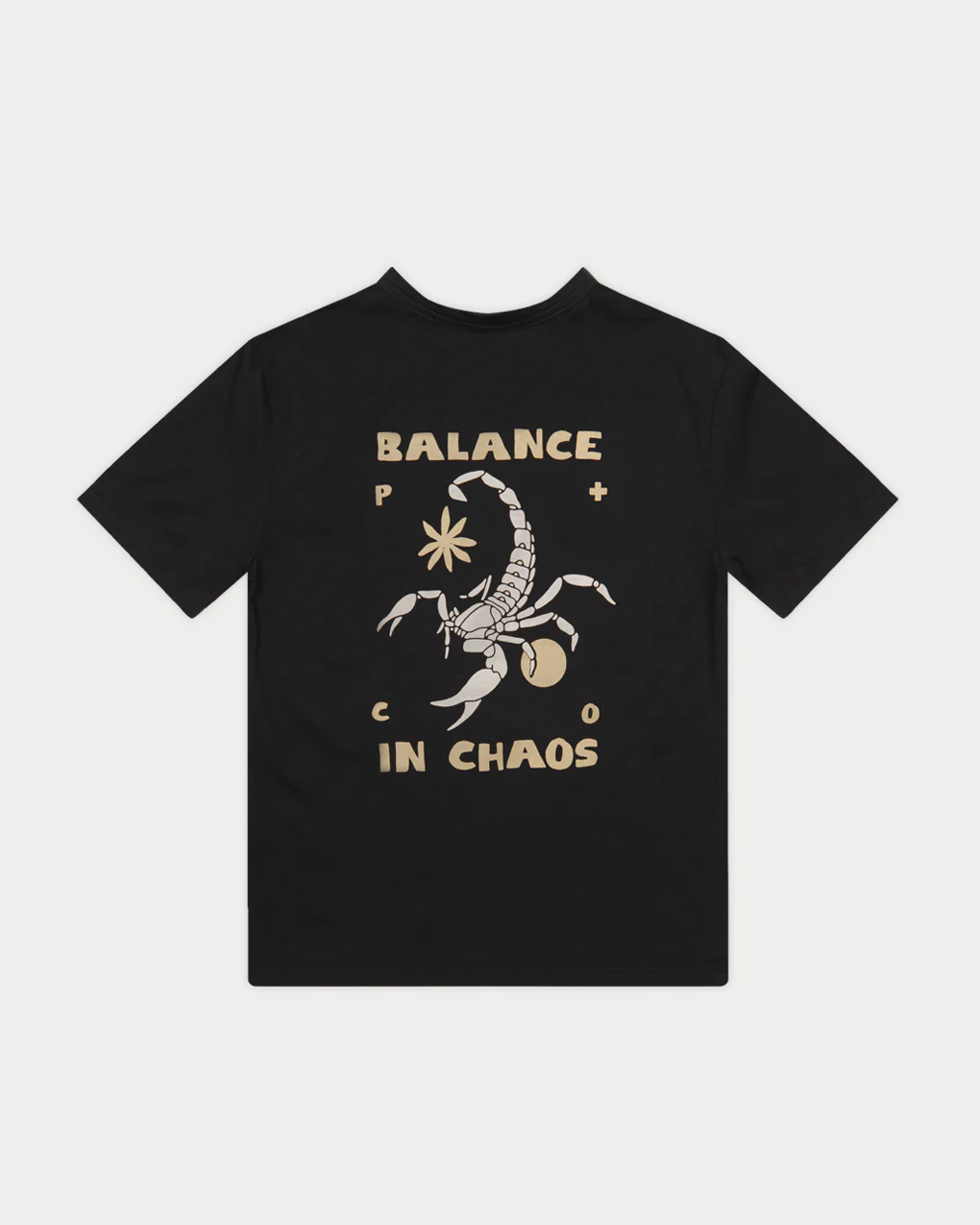 The Balance In Chaos T-Shirt in washed black is a men’s regular-fit graphic tee made from 100% organic cotton. This tee features a bold front and back screen print combining montage techniques with flash tattoo design. The organic cotton used is grown without pesticides or synthetic chemicals. By choosing organic cotton, the production process uses significantly less water and energy, making it a more sustainable option.