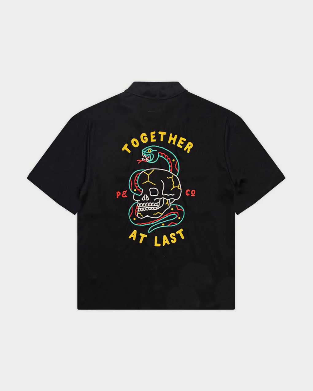 Our Together At Last Bowling Shirt in black is a classic boxy-fit Cuban shirt. Made from a Lyocell fabric, it is a lightweight and breathable piece that is perfect for summer. Inspired by American past-times & 1950’s culture, it features a revere collar and bold chain-stitch embroidery on the reverse.