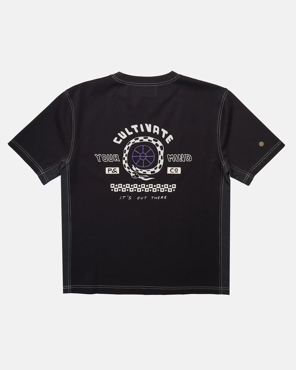 The Mindset Trail T-shirt in washed charcoal combines activewear performance with a hand-drawn graphic style. This activewear tee was built to move with you, constructed from a blend of cotton, polyester, and spandex for comfort and flexibility. The perforated fabric panelling at the sides and under the arms ensures breathability, while the reflective graphics will keep you visible on the trail.
