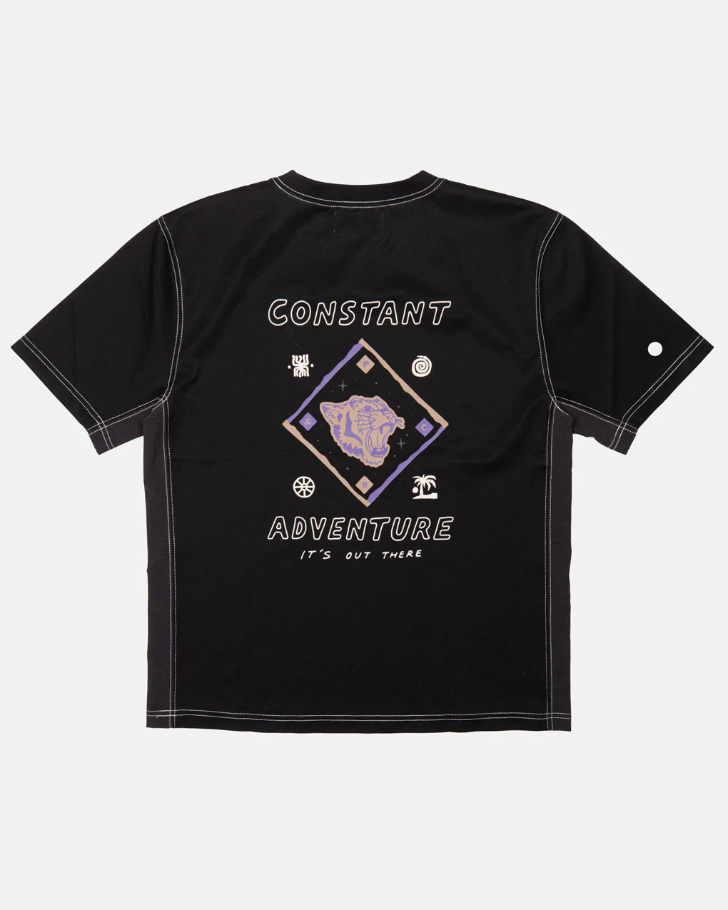 The ‘It’s Out There’ Trail T-shirt in washed black combines activewear performance with a hand-drawn graphic style. This activewear tee was built to move with you, constructed from a blend of cotton, polyester, and spandex for comfort and flexibility. The perforated fabric panelling at the sides and under the arms ensures breathability, while the reflective graphics will keep you visible on the trail.