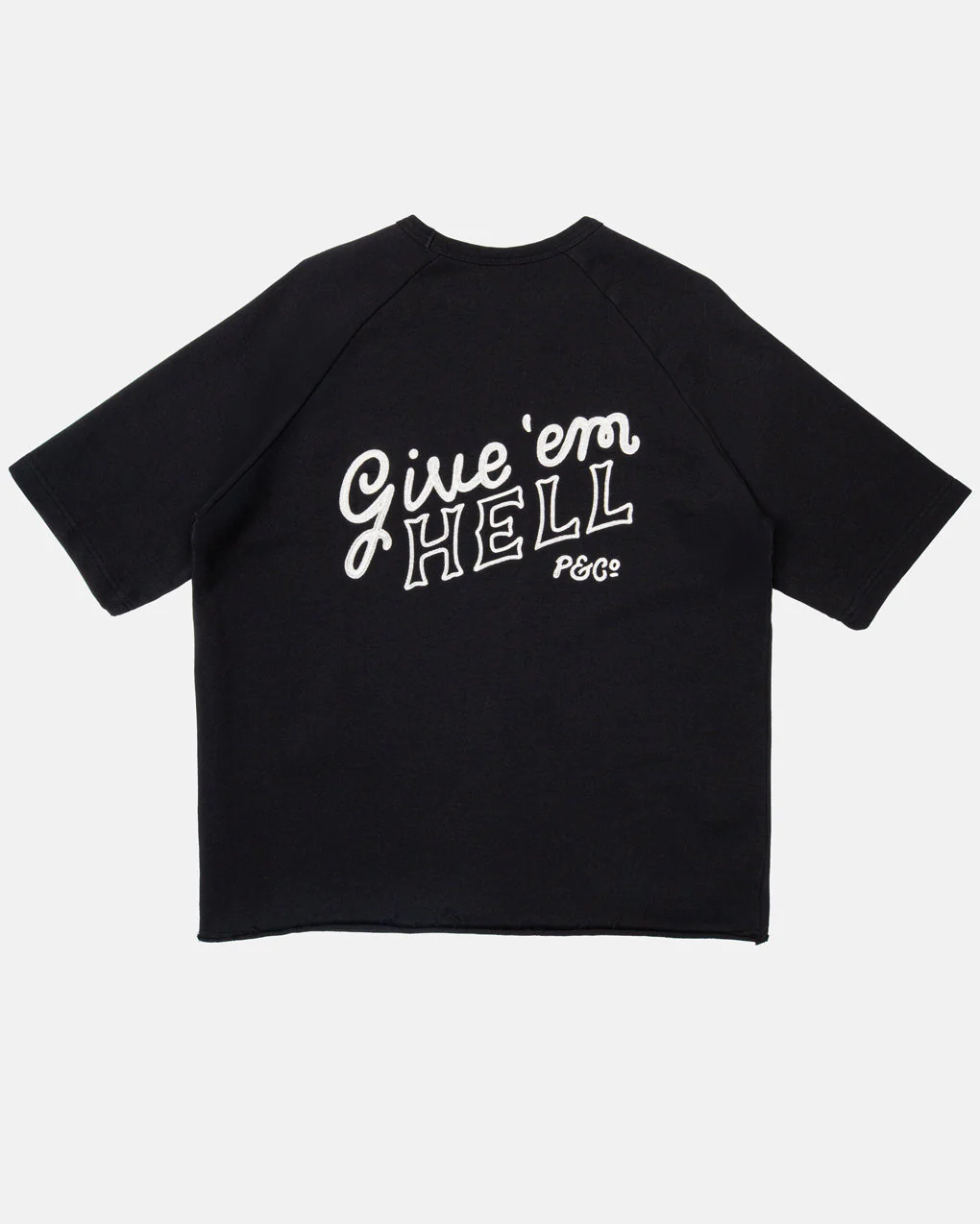 Inspired by 1950s motorcycle culture, the Give ‘Em Hell Short Sleeve Sweatshirt is a vintage-style piece designed to feel lived-in from day one. Made from a heavyweight 400gsm French Terry loopback, it features a garment-dyed wash that creates natural fading and seam variation for an authentic aged look. Chain-stitched front and back artwork add a true heritage feel, while raglan sleeves and a raw hem enhance its rugged character.