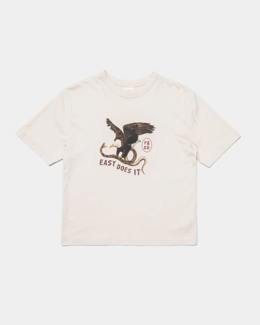 The Easy Does It Boxy T-Shirt in bone is a men’s boxy-fit tee inspired by vintage ‘80s band tees and music culture. It is made from mid-weight 220 GSM 100% organic cotton and features a garment-washed finish for a soft, worn-in feel. The design includes a screen print with digitally hand-painted graphics.