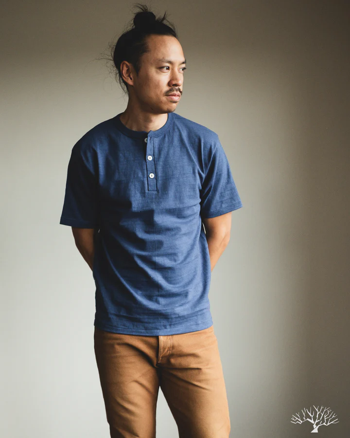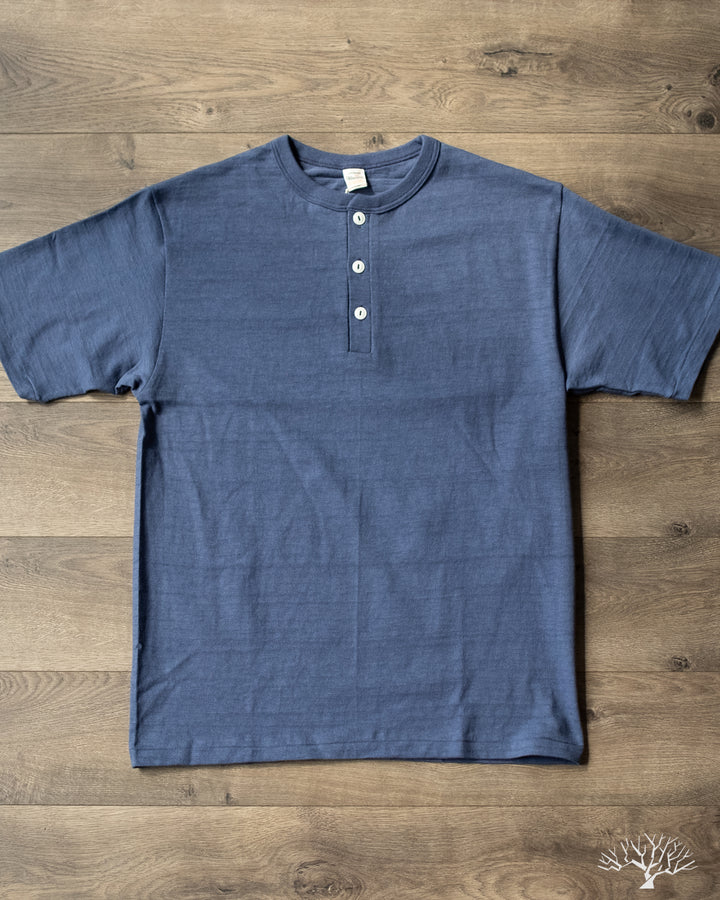 These Warehouse Henley T-Shirts in Faded Blue are produced using their custom-knit slubby fabric for a smart-casual basic. This Faded Blue tee is made from 100% cotton on vintage 1960s sinker knitting machines, and have a tubular knit and a beautiful uneven textured appearance. Notable are the horizontal streaks of texture that you’ll see at certain angles. These Warehouse tees have an excellent hand, and are a nice balance between soft and comfortable, yet with a decent weight to them.
