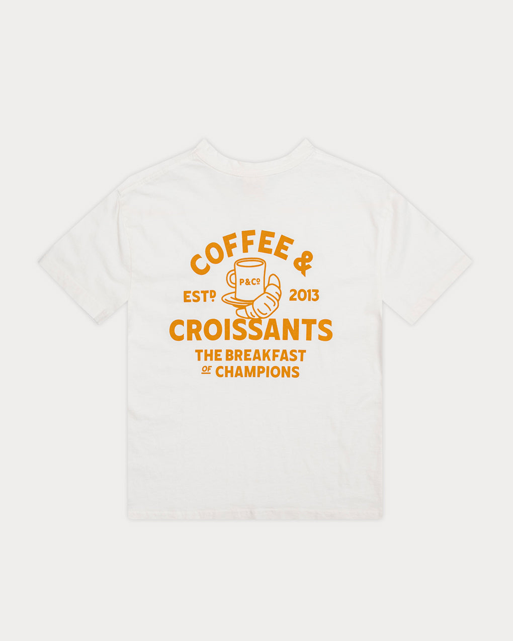 Our Coffee & Croissants T-shirt in off-white is a relaxed men’s fit graphic t-shirt, made from a mid-weight soft cotton jersey. The classic crewneck features a hand-drawn graphic, chosen by you, screen-printed on the reverse.