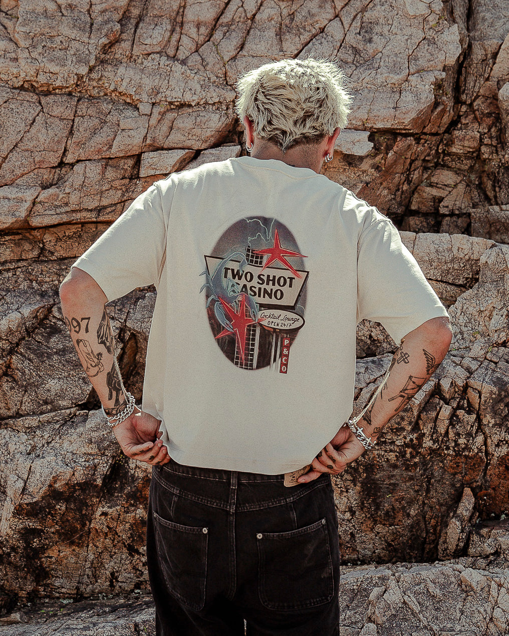 The Two Shot Casino T-shirt in bone is a men’s boxy-fit graphic t-shirt made from mid-weight 240 GSM organic cotton. This vintage-inspired t-shirt is slightly shorter than our regular fit crew necks, creating a boxy, nostalgic silhouette.