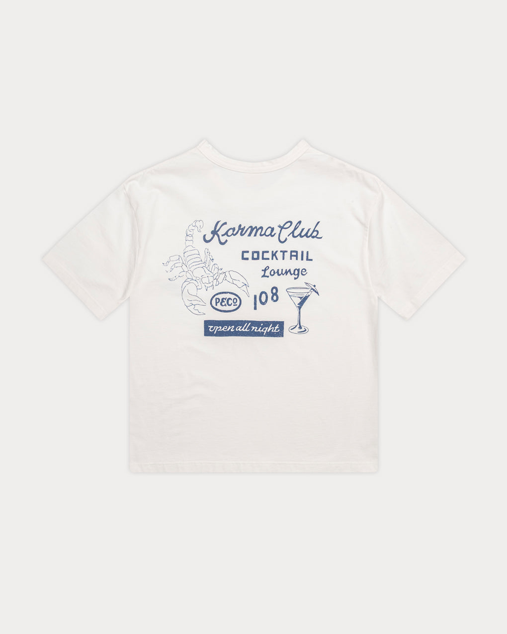 The Karma Lounge T-shirt in off-white is a men’s boxy-fit graphic t-shirt made from a mid-weight 240 GSM organic cotton. This vintage fit t-shirt has a slightly shorter length, compared to our regular fit crew necks, to create a more boxy & nostalgic look. It also features a screen-printed back graphic inspired by American pastimes.